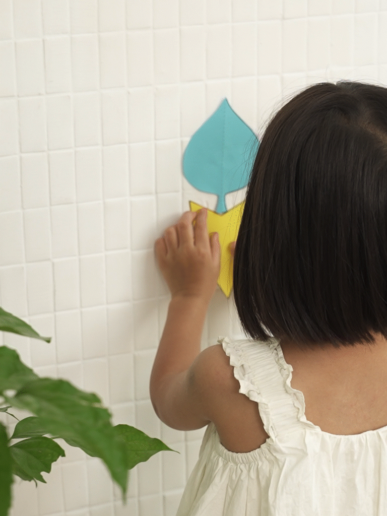 Children love to stick on paper. After cutting the paper, stick some tape on the back and stick it on the wall without leaving any glue residue.